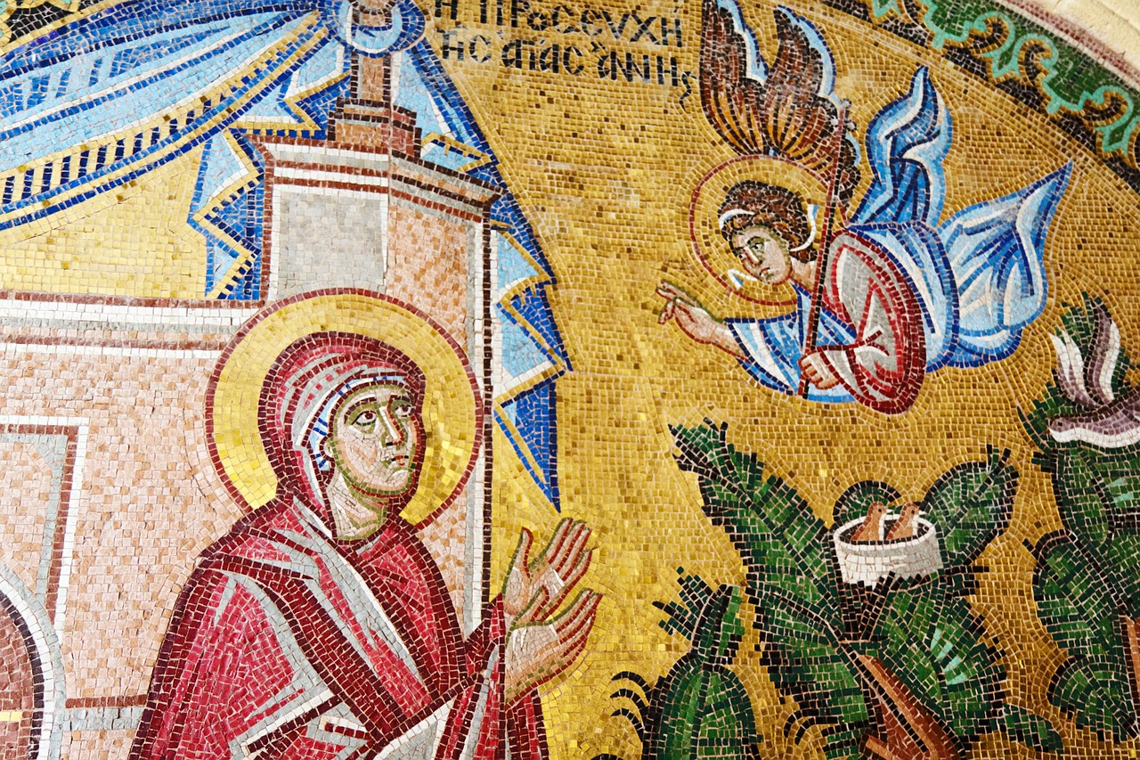 La mosaïque murale byzantine n’ayant jamais du répondre à des exigences fonctionnelles, formée de tesselles vitreuses volontairement enfoncées plus ou moins de biais par rapport au plan et non polies, pour mieux capter et réfracter la lumière. Les mosaïques sont conçues pour pouvoir être observées d’en bas et de loin, les modifications possibles de l’angle de vision n’excédant pas 180°. Du fait de la légère inclinaison de tesselles, de la nature des matériaux utilisés, la lumière est dans les mosaïques byzantines, une partie intégrante de l’œuvre et fait continuellement vibrer les surfaces. L’emploi de fonds d’or, à la place de fonds blancs de l’art antique, sera caractéristique de l’art byzantin (Basilique Sainte-Sophie – Istanbul, Basilique Saint-Marc – Venise).