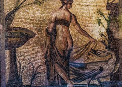 Les Romains annexent la Grèce en 27 av. J.C. Qui devient ainsi une province romaine. Les Romains vont alors adopter et assimiler la culture grecque tout en créant leur propre style. Les Romains ont développé l’art de la mosaïque dans l’immensité de leur empire au point que la mosaïque de pavement est considérée comme un « ars romana » par excellence.