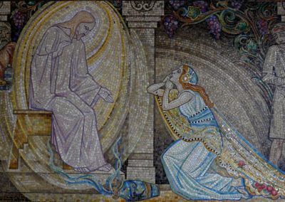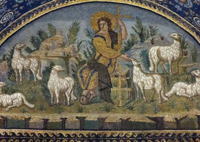 C’est à Ravenne, entre le V et le VI siècle, que la rencontre magique entre le délicat réalisme spirituel paléochrétien et le mysticisme chromatique de l’art byzantin naissant, revêtit d’or la victoire du Christ sur les ténèbres. Ainsi, certains des plus grands chefs d’œuvre de la mosaïque pariétale et de voûte sont presque toujours composés de tesselles d’émaux et d’or. La lumière et la couleur en sont des éléments dominants. (« Impératrice Théodora », « Les colombes se désaltérant », connues dans le monde entier, patrimoine culturel de l’Humanité).